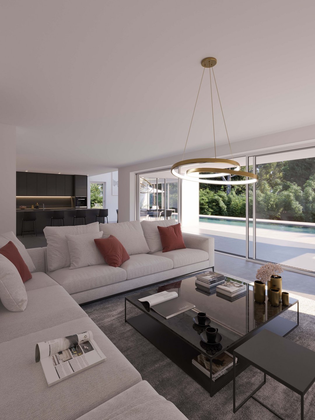 Οι 3D απεικονίσεις περιλαμβάνουν μεταξύ άλλων το σαλόνι, την κουζίνα και τον εξωτερικό χώρο με την πισίνα, προσφέροντας ένα ισχυρό εργαλείο παρουσίασης για αρχιτέκτονες, επενδυτές και πελάτες υψηλών απαιτήσεων.