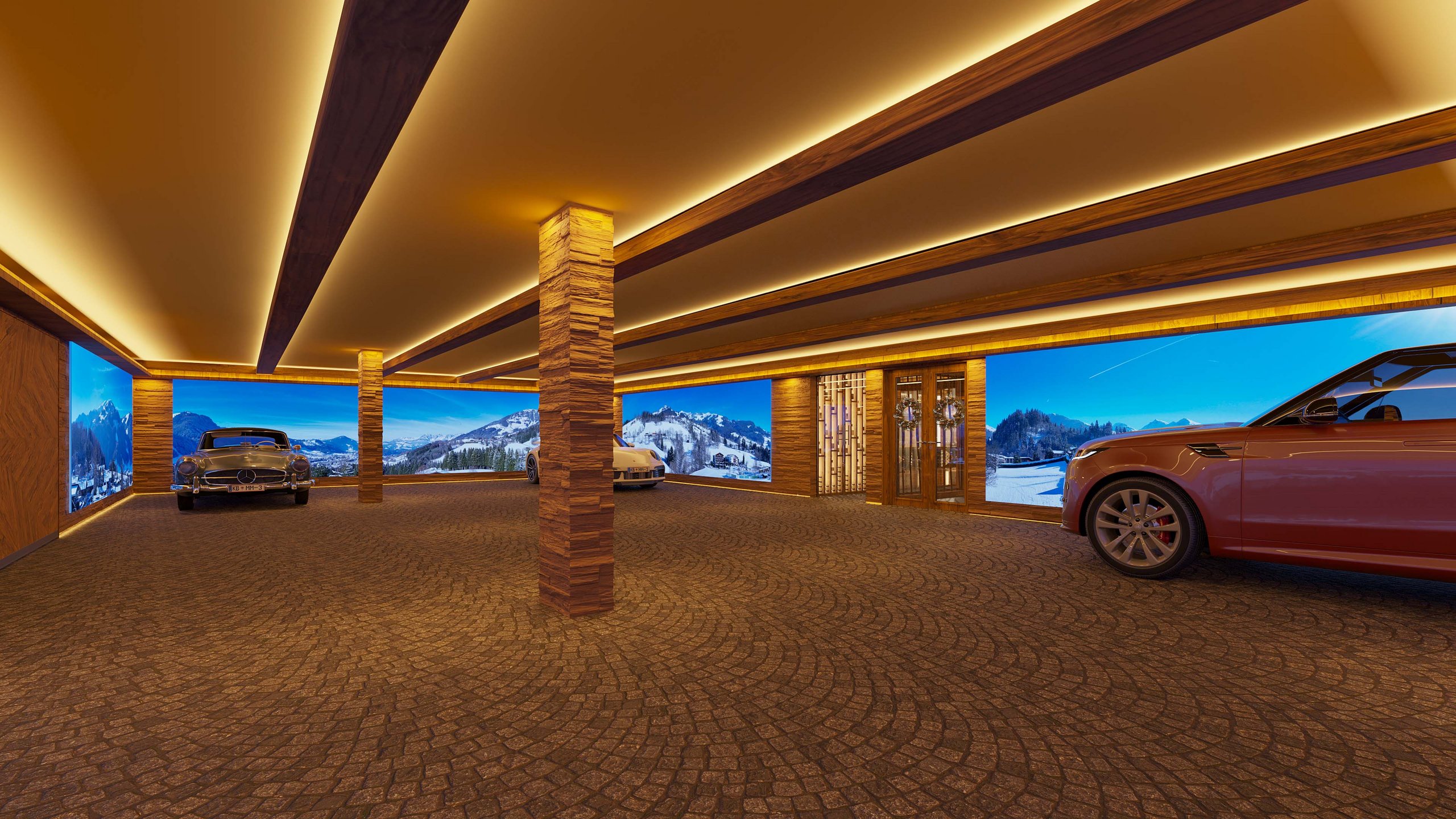 Από την πανοραμική σάουνα και το ιδιωτικό σπα έως το κελάρι κρασιών και το home cinema, κάθε χώρος αποτυπώνεται φωτορεαλιστικά με ακρίβεια και ατμόσφαιρα, συνδυάζοντας την αρχιτεκτονική με τα υλικά και τη σχεδιαστική ταυτότητα του έργου. Τα renderings παρουσιάζουν ένα επιβλητικό χειμερινό σκηνικό, όπου η αλπική κομψότητα συναντά τη μοντέρνα καθαρότητα.