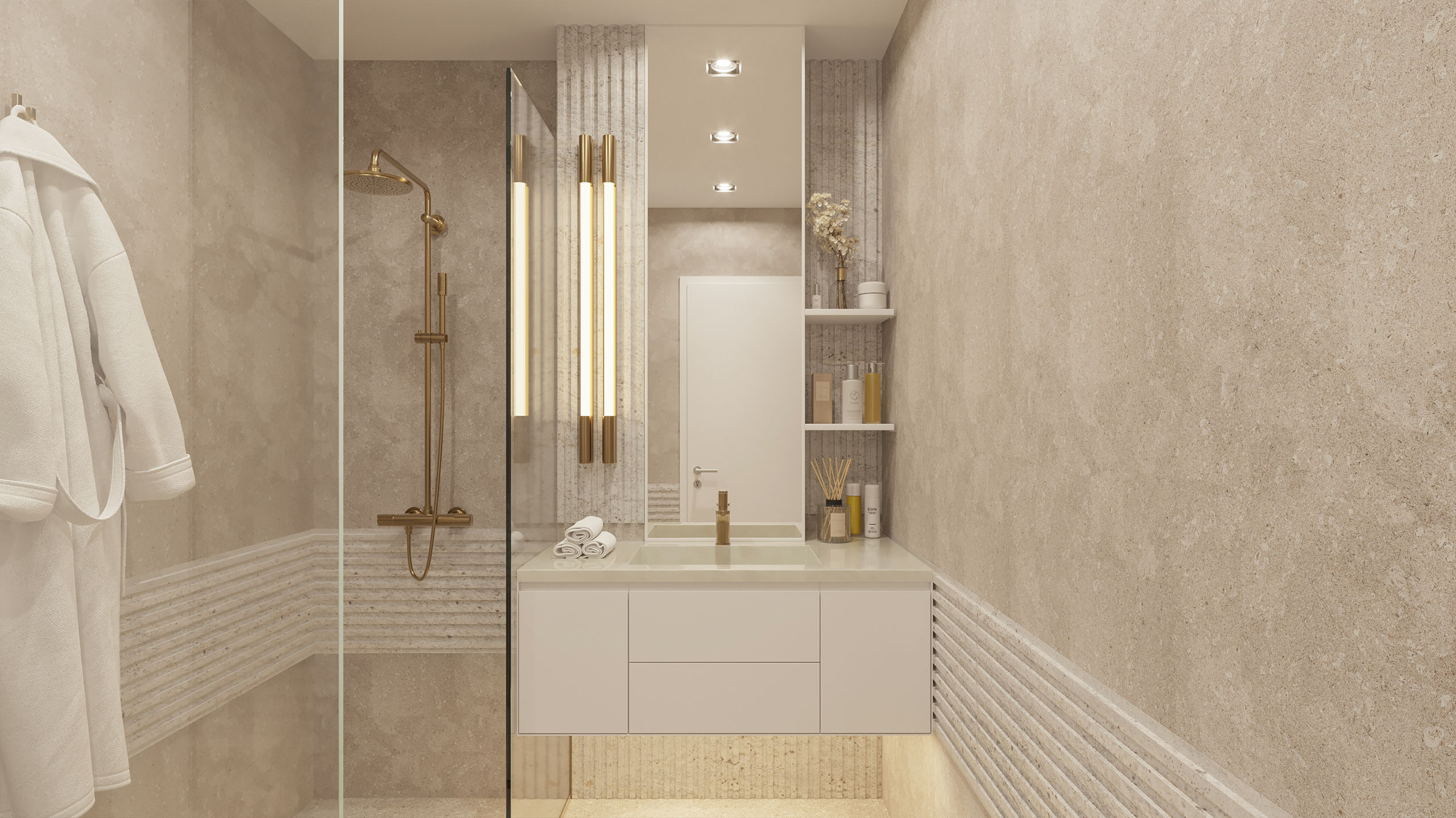 Ιδιαίτερη προσοχή δόθηκε και στον σχεδιασμό του μπάνιου. Η χρήση φυσικής πέτρας, οι καθαρές γραμμές και τα ποιοτικά στοιχεία εξοπλισμού δημιουργούν έναν μοντέρνο και πολυτελή χώρο.